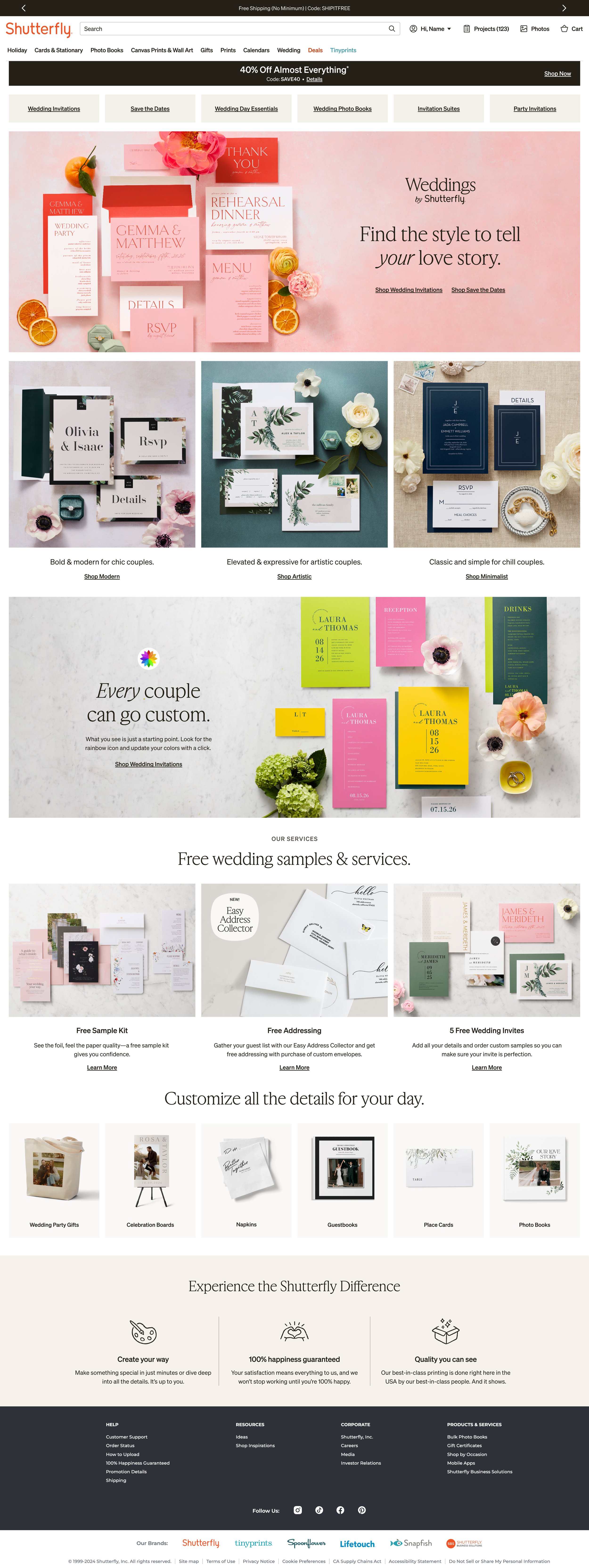 In 2025, I directed the relaunch of the Wedding category for Shutterfly, including writing new wedding messaging that targeted a younger demographic. The goals of the campaign were to elevate the Shutterfly product offering and introduce Shutterfly to brides’ consideration set by positioning Shutterfly as an affordable premium choice for wedding stationery.